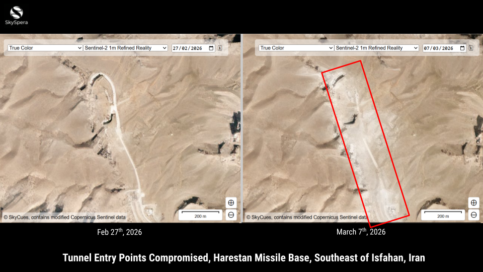 In a recent analysis, the SkySpera system was employed to capture the aftermath of airstrikes on tunnel entry points at the Harestan Missile Base, located to the south of Isfahan, Iran. The imagery collected showcased extensive damage, providing clear insights into the operational capabilities and vulnerabilities of the site.